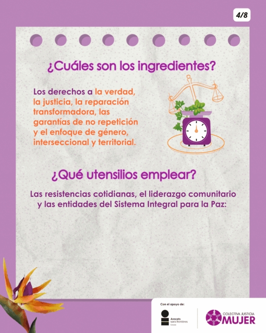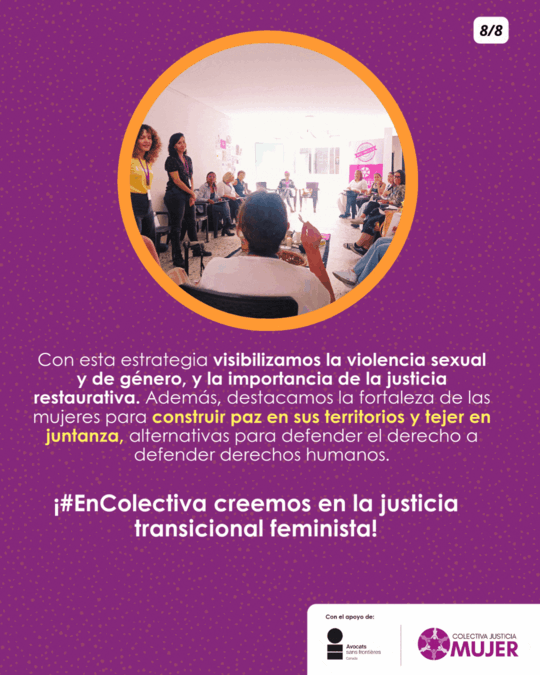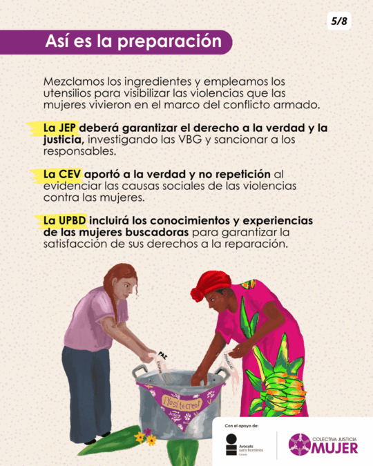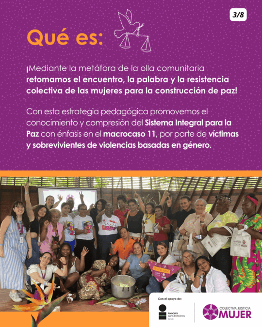 Mediante la metáfora de la olla comunitaria retomamos el encuentro, la palabra y la resistencia colectiva de las mujeres para la construcción de paz. Con esta estrategia pedagógica promovemos el conocimiento y compresión del Sistema Integral para la Paz con énfasis en el macrocaso 11, por parte de víctimas y sobrevivientes de violencias basadas en género.